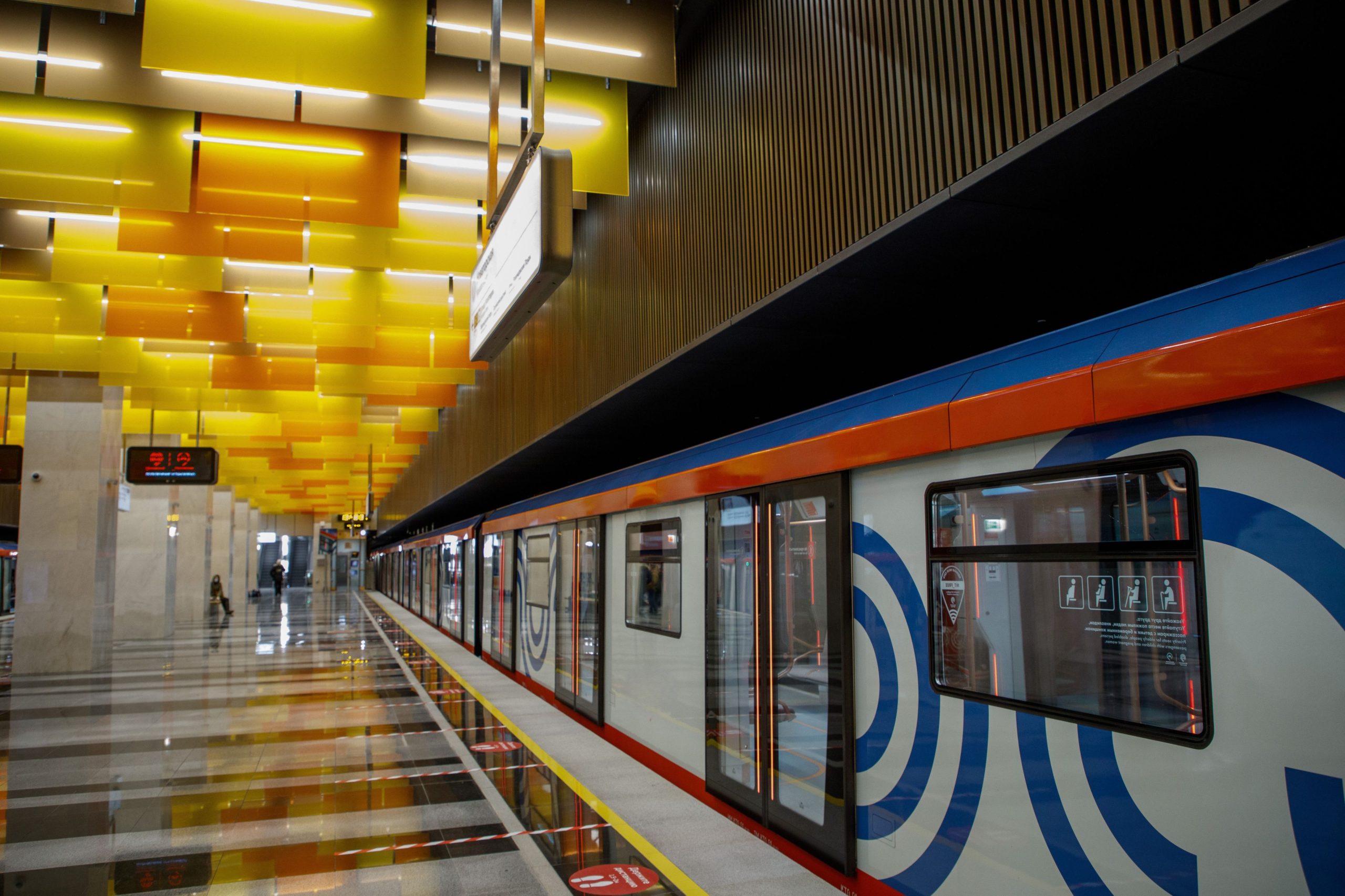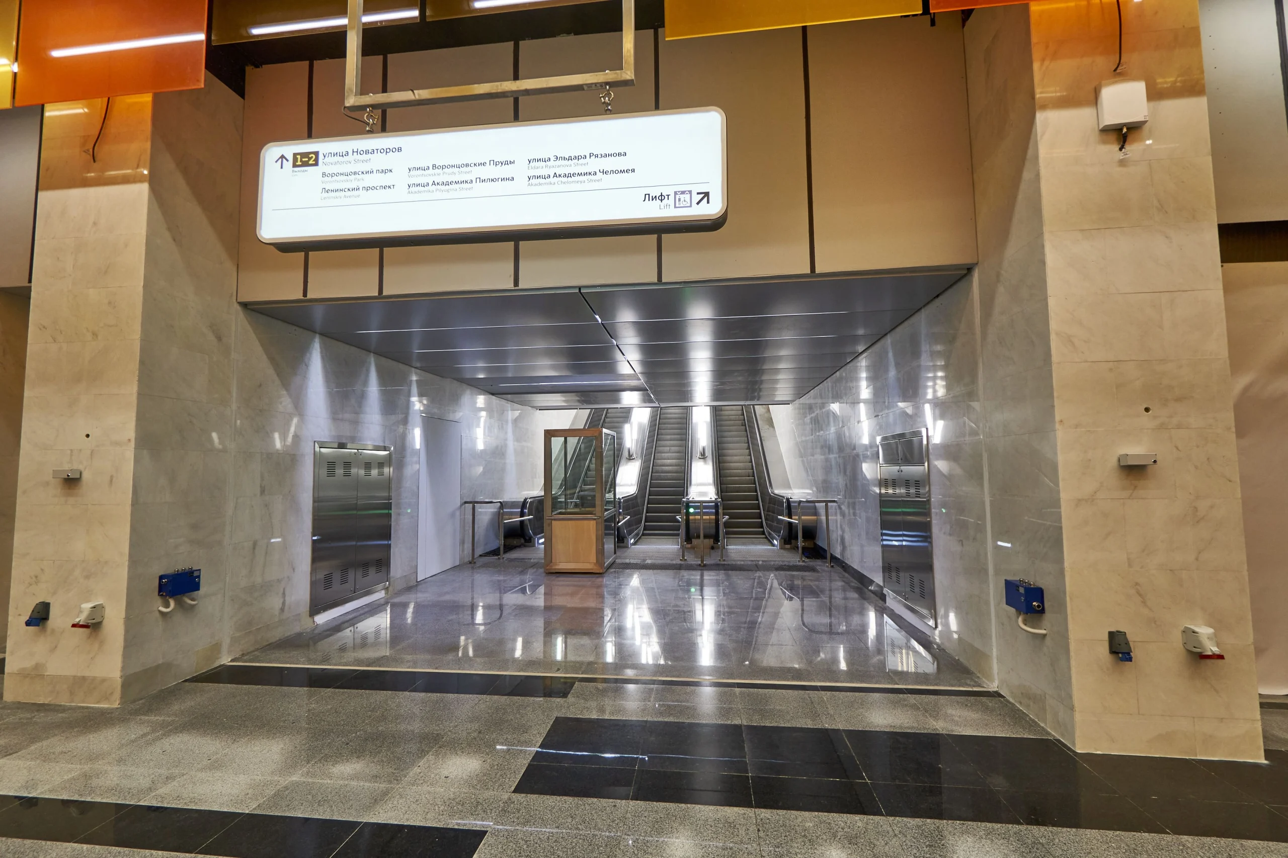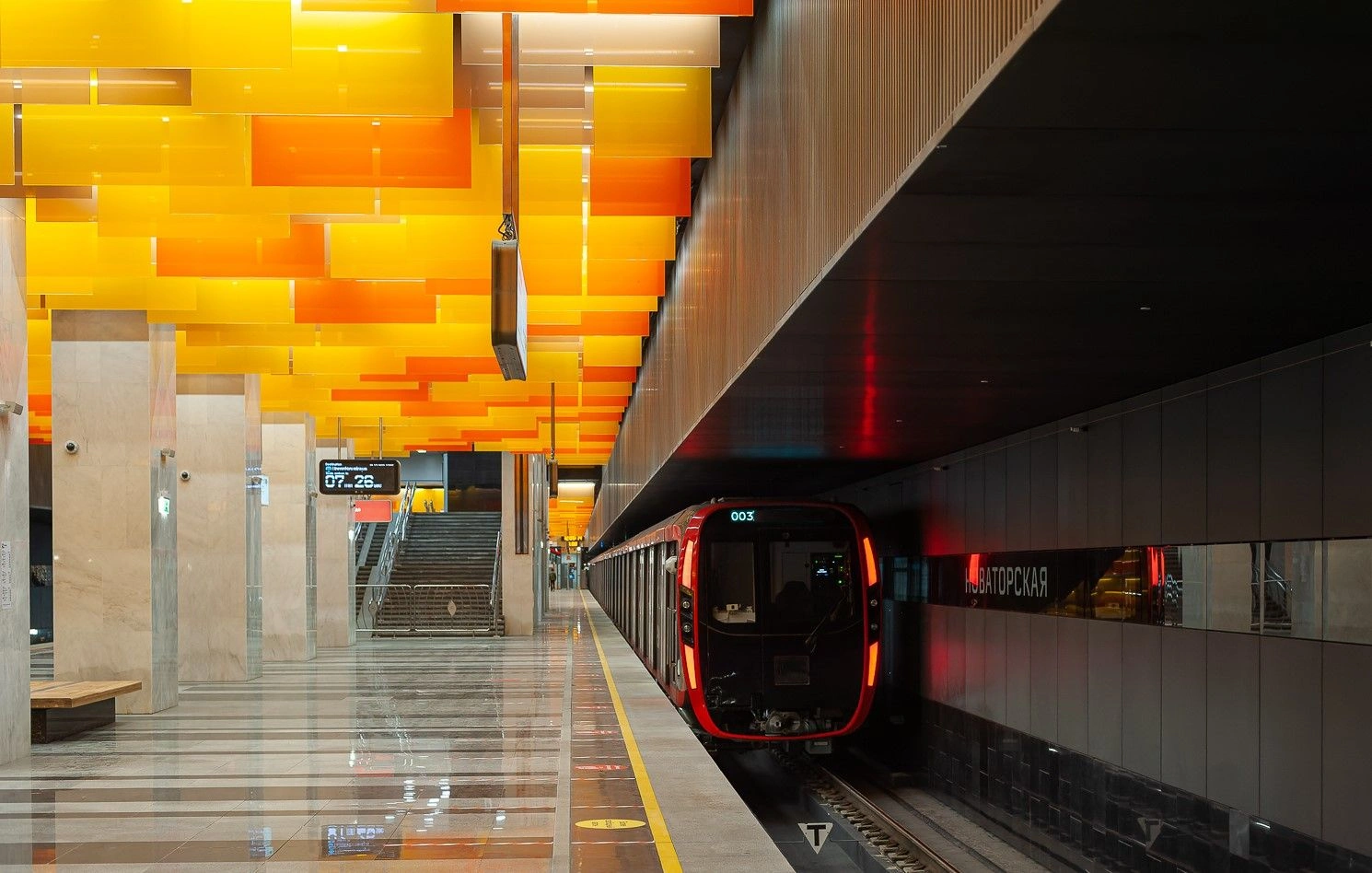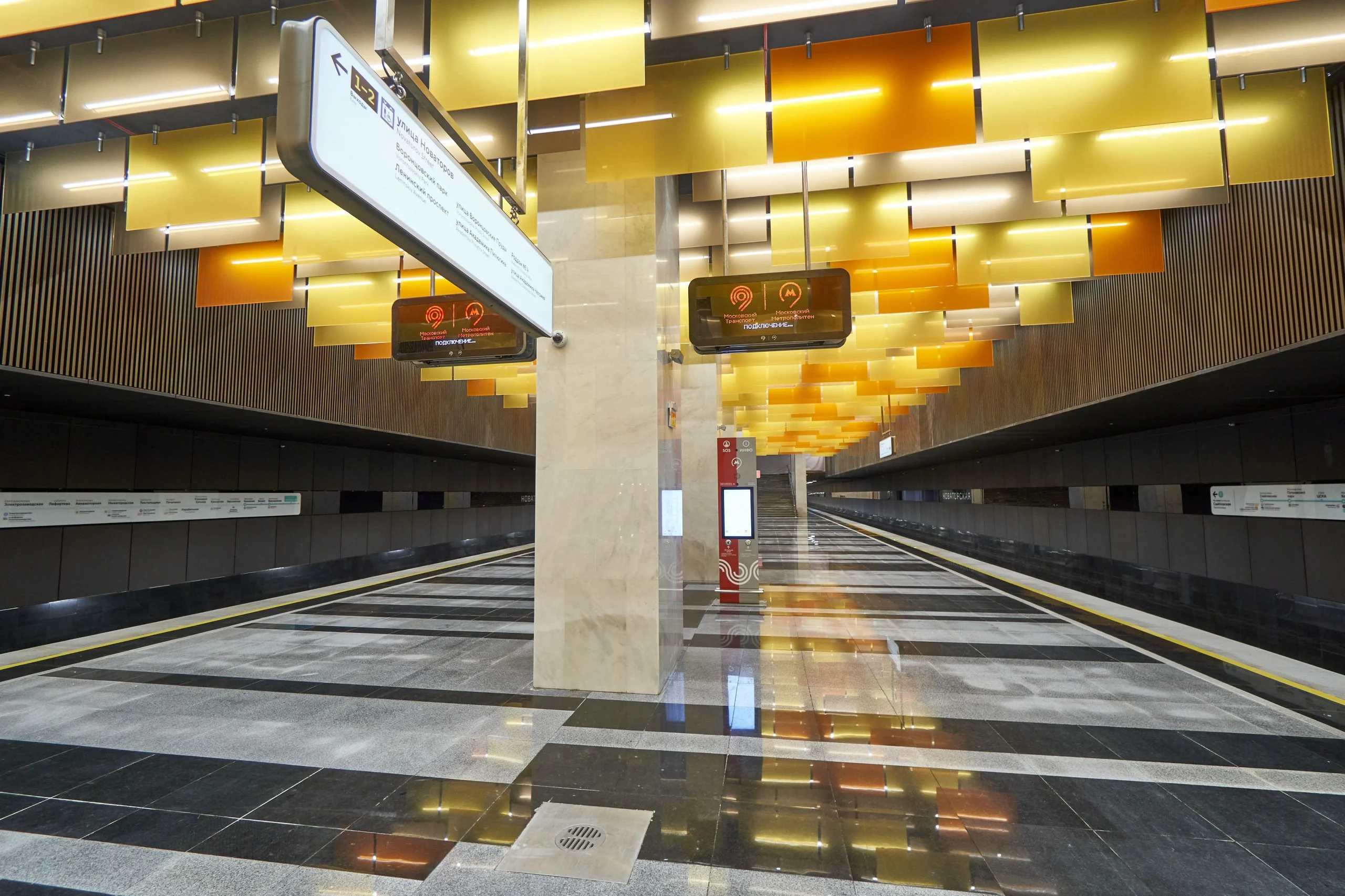 Novatorskaya Metro Station is a modern transport facility of the Moscow Metro on the Large Circle Line (LCL), located at the intersection of Leninsky Prospekt and Novatorov Street on the border of the Prospekt Vernadskogo and Obruchevsky districts. The station is designed as a shallow column two-span station with an island platform and two underground vestibules with exits to the street and surface transport. The architectural design of the station is distinguished by a bright “flaming” suspended ceiling made of colored glass panels.